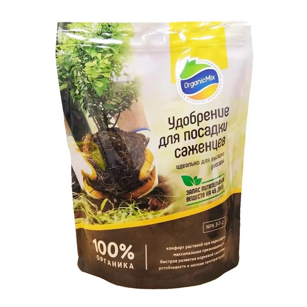 Удобрение OrganicMix для посадки саженцев, запас питательных веществ, 200 гр содержит высокий уровень аминокислот для быстрого укоренения и восстановления поврежденных корней. Повышенное содержание морских водорослей способствует накоплению запаса сахаров для устойчивости к пониженным температурам. При использовании удобрения необходимо часть гранул смешать с почвой в посадочной яме, часть распределить по поверхности. Далее - прорыхлить грунт на глубину 5 см, обильно полить, в завершении процесса желательно замульчировать.