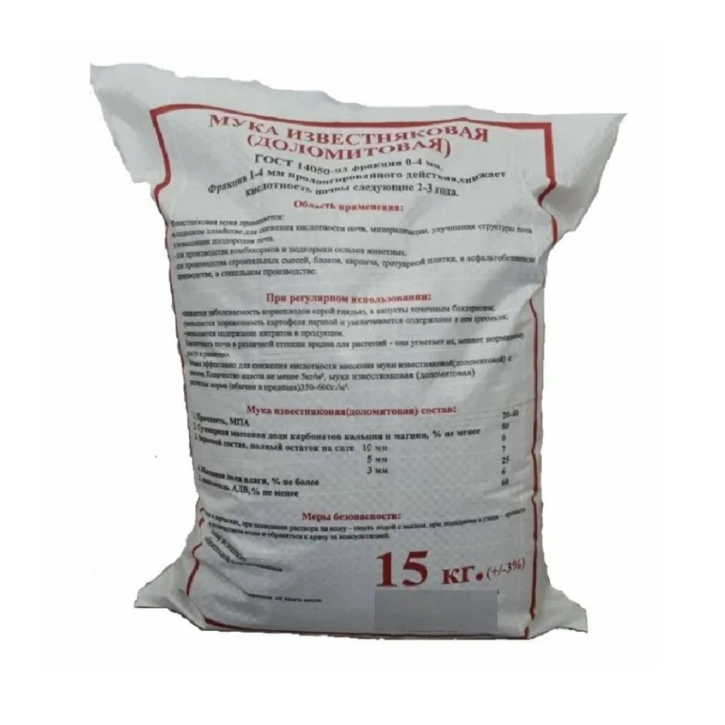 Удобрение Минерал-Агро Мука известняковая (доломитовая), 15 кг - это экологически чистое удобрение для почвы, является природным минеральным продуктом, который предназначен для известкования, раскисления почвы и ее обогащения кальцием и магнием с целью улучшения структуры и повышения плодородия почвы на дачном и приусадебном участке, огороде или в фермерском хозяйстве. Мука может вносится как в открытый грунт, так и в парники или теплицы.