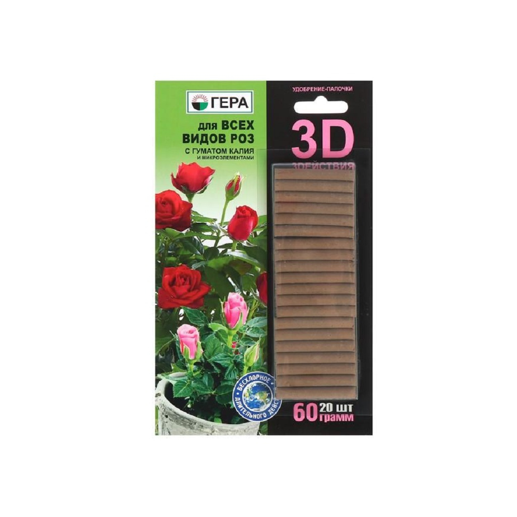 Удобрение Гера для всех видов роз 3D 3 действия, палочки с гуматом калия и микроэлементами, 20 штук, 60 г - это комплексное удобрение длительного действия для подкормки всех видов садовых и декоративных роз. Рекомендовано применение на любых почвах. Удобрение-палочки содержит все необходимые макро- и микроэлементы в оптимальном соотношении. Не содержит хлора и нитратного азота.Благодаря особым формам связи питательных веществ гарантируется дозированная подкормка растений в течение 2-3 летнего вегетационного периода.