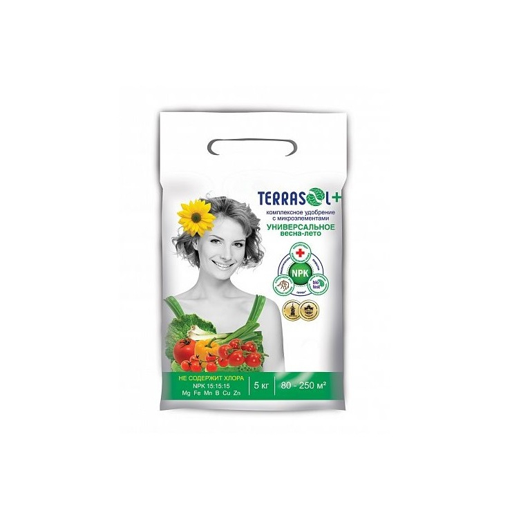 Удобрение TerraSol + Весна-лето универсальное, с микроэлементами, 5 кг - эта идеально подобранная пропорция элементов питания гарантирует здоровый рост и развитие таких культур как капуста, столовые корнеплоды (морковь, свекла и др.), огурец, кабачок, патиссон, томат, перец, баклажан, лук, чеснок, зеленные культуры, картофель, плодово-ягодные и цветочно-декоративные культуры