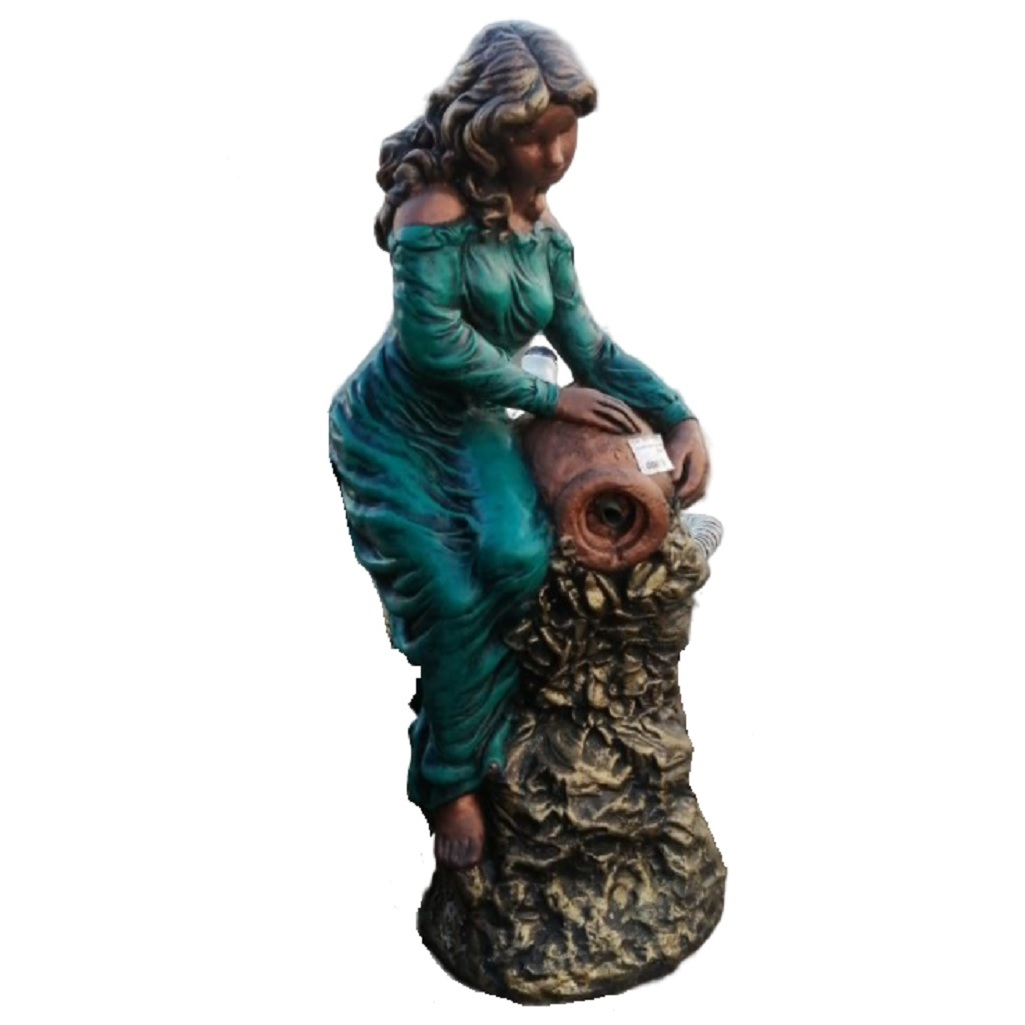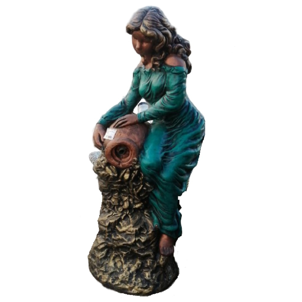 Фонтан выполнен в классическом или античном стиле, изображая нимфу – мифологическое существо, символ природной гармонии и красоты. Основание – чаша или постамент, иногда с декоративными элементами (ракушки, волны, листья). Фигура нимфы – представлена с кувшином, из которого льется вода. Система циркуляции воды – встроенный насос, обеспечивающий непрерывное движение воды.