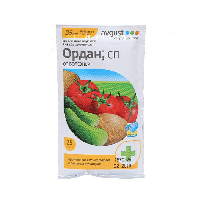 Фунгицид Ордан – препарат для защиты овощных культур и картофеля от болезней. Характеризуется уникальным сочетанием двух активных веществ с различным механизмом действия. Он применяется для борьбы с фитофторозом и альтернариозом на томатах и картофеле, а также для борьбы с пероноспорозом на огурцах. Обладает профилактическими и лечебными свойствами, проникает в ткани растений и локализует очаги инфекции, не позволяя ей распространяться. Не вызывает привыкания у возбудителей болезней. Ордан безопасен в применении, он быстро разлагается на безвредные вещества.