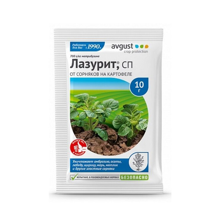 Лазурит – гербицид избирательного спектра действия для борьбы с сорняками на картофеле. Его особенность в том, что он избирательно уничтожает только сорную растительность, не оказывая отрицательного воздействия на картофель. Препарат уничтожает сорняки в момент их прорастания в довсходовом или в течение 10-20 суток при послевсходовом применении. Обеспечивает защиту на протяжении 1-2 месяцев. Обработку Лазуритом можно проводить и по проросшему картофелю, но при высоте ботвы до 5 см.