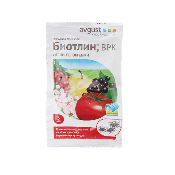 Инсектицид Биотлин - системный препарат для уничтожения различных видов тли на плодовых, ягодных, овощных и цветочных культурах. Также уничтожает других сосущих вредителей: белокрылку, яблонного цветоеда, цикадок, трипсов на огурцах, томатах и цветах, яблоне и смородине. Проникая во все части растения, препарат воздействует на насекомых как при контакте с их внешними оболочками, так и при попадании в кишечный тракт, когда вредители питаются соками культур. Взрослые насекомые и личинки разных возрастов погибают в течение нескольких часов после обработки, и далее защитное действие сохраняется от 14 до 21 суток (на разных культурах и для разных вредителей по-разному). Препарат не вызывает привыкания у насекомых.